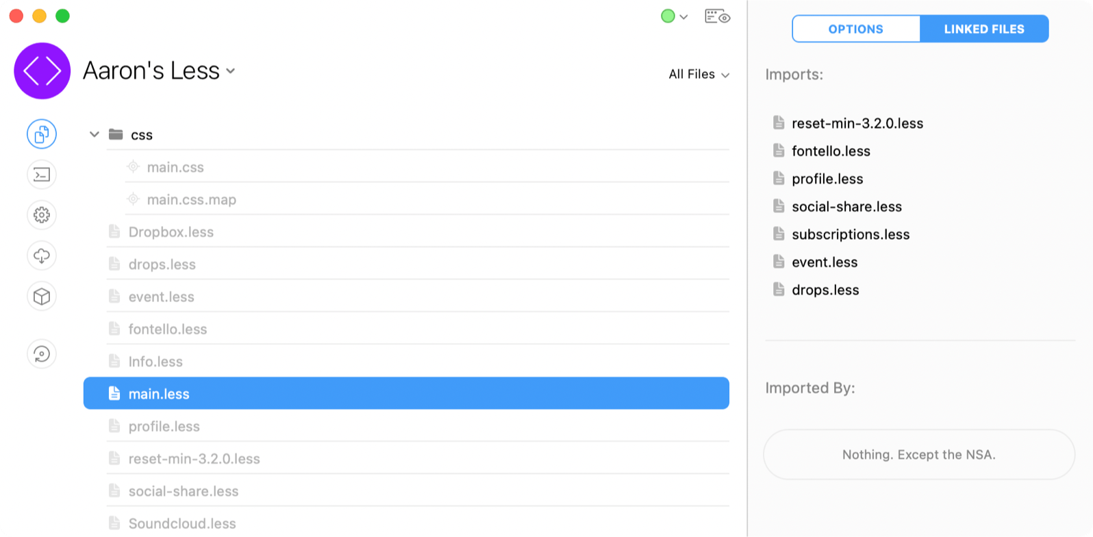 Compress css file main (string): On the first line of less files, add a valid json comment, not including the outer brackets ('{' and '}'), with the following properties: Best and secure less to css works well in windows, mac, linux, chrome, firefox, safari and edge. Throws atom success notification when files compiled. Generates css boilerplate based on the selected html. Path to your main less file to be compiled. Only cares about classes, ignores id's/other possible selectors.. Supports css, scss, sass, less and possibly other syntaxes.